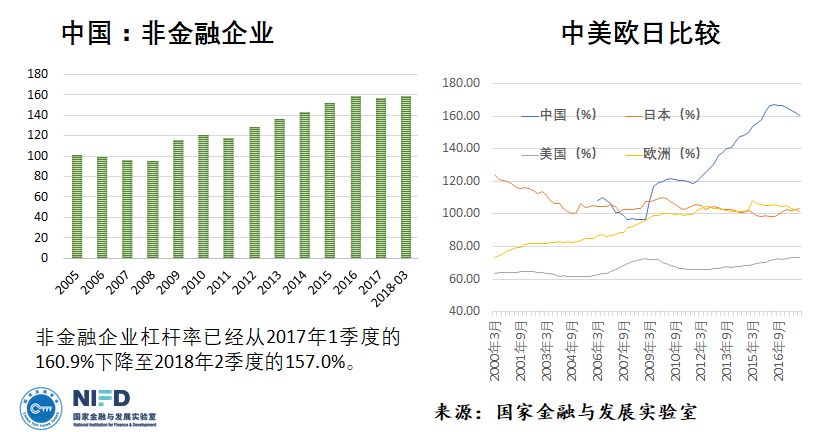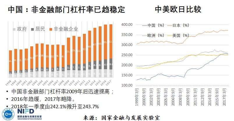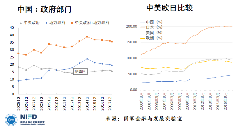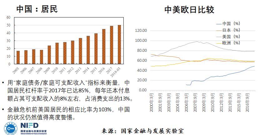 接下来我们看杠杆问题,前面我们讲杠杆率攀升是全世界金融问题的集中体现,这在中国也一样,我们给的从上面几张图,每个给两张图,一张是中国自己的变化左边,一张是和世界上主要国家日本、欧洲、美国的比较。