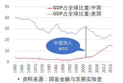 中美关系已经变质,对华政策已经形成新共识,中美关系由接触调整为规锁,接触承认你是利益攸关方,规锁你是异类要对你进行限制。这个变化是怎么发生的呢?这两张图我们给了两个事实。一个事实我们先看右边,这是中国和美国各自对全球GDP贡献的变化,我们看到很清楚,从1960年这样算过来,美国是不断降低,最近几年下降更快。中国加入WTO是一个节点,从此中国不断上升,美国不断下降。
