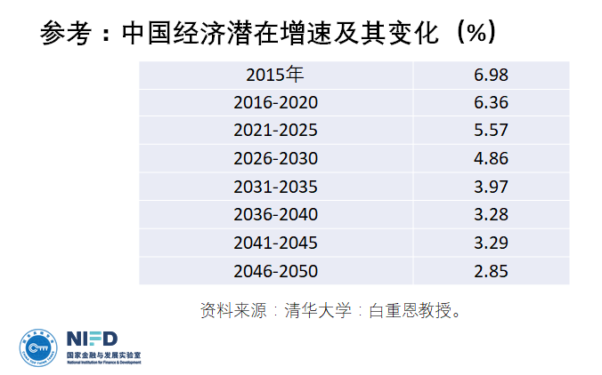 这里给出一个长期预测,大家知道做这个预测的很多,潜在增长率,我们现在引述清华大学白重恩教授做的预测,而且是几年前的预测,现在看来还是相当的靠谱的。他告诉我们,整个经济还是不断下降的态势,潜在的态势是充分就业,考虑实体因素充分的使用起来可能达到,当然同时它也是实质的,实质增长再加上名义增长再加上这个股价变化,其实也不用特别的悲观,按照这个预测到2050年也依然有5%左右的名义增长。